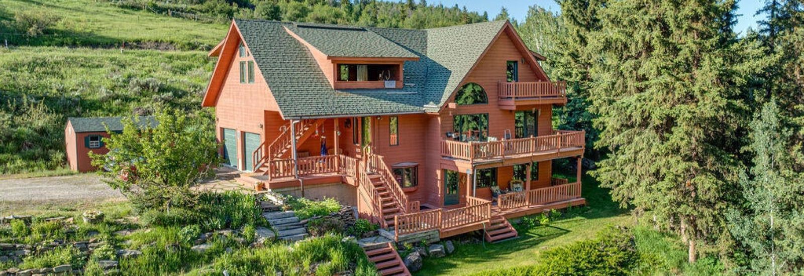 PEACEFUL SETTING. Enjoy sitting on your deck while listening to a year-round creek and watching an abundance of wildlife. Less than twenty minutes south of town, bordered on two sides by National Forest, this six bedroom, four bathroom, single-family home on 2.5 acres offers three private entrancesâample space for guests and extended family. With large finished basement and apartment over the garage, you can configure rooms as desired, with possible rental income. Lots of natural light as floor to ceiling windows show beautiful views of buttes and rock formations. Multiple outdoor decks allow for easy indoor-outdoor flow.